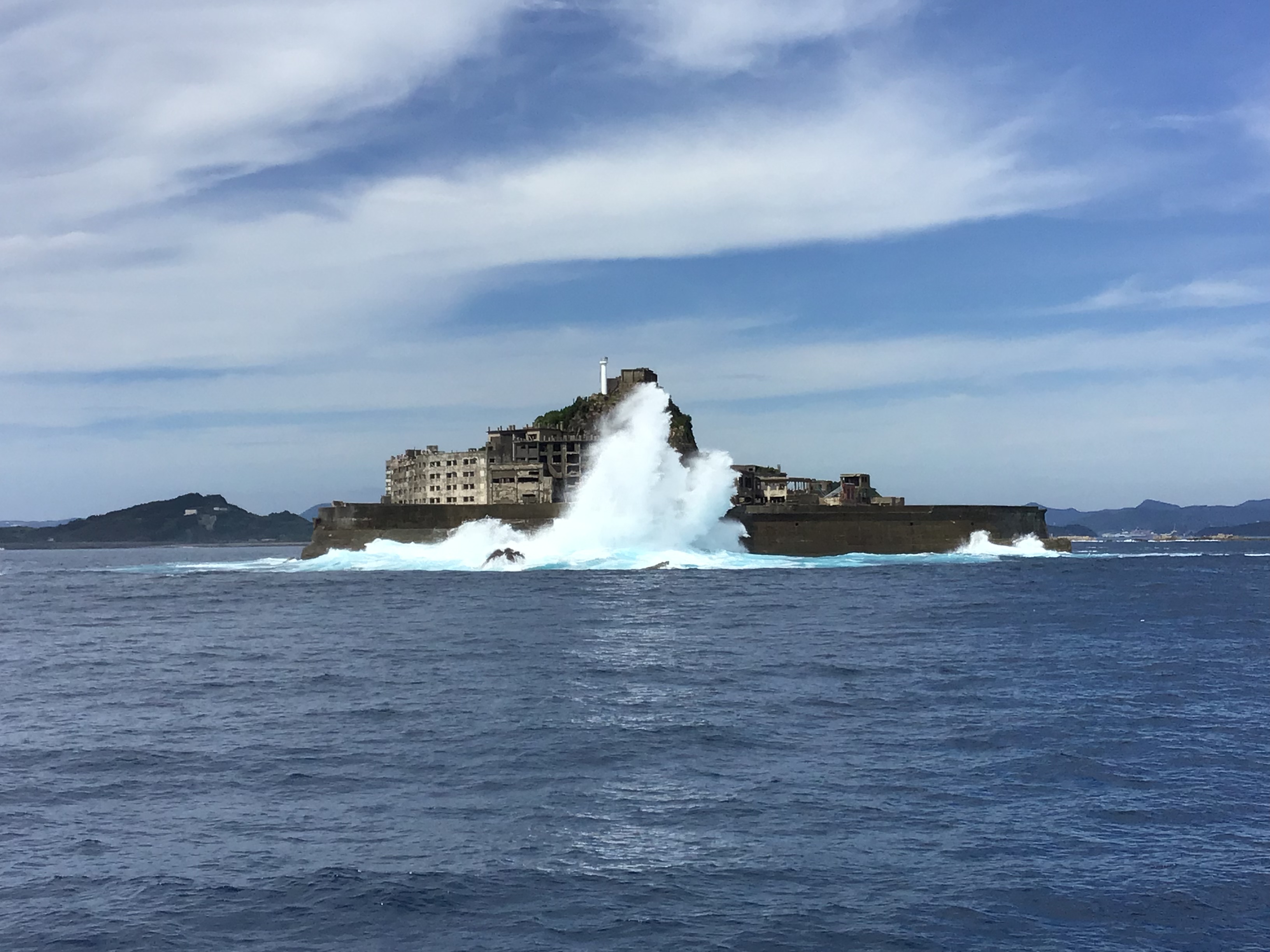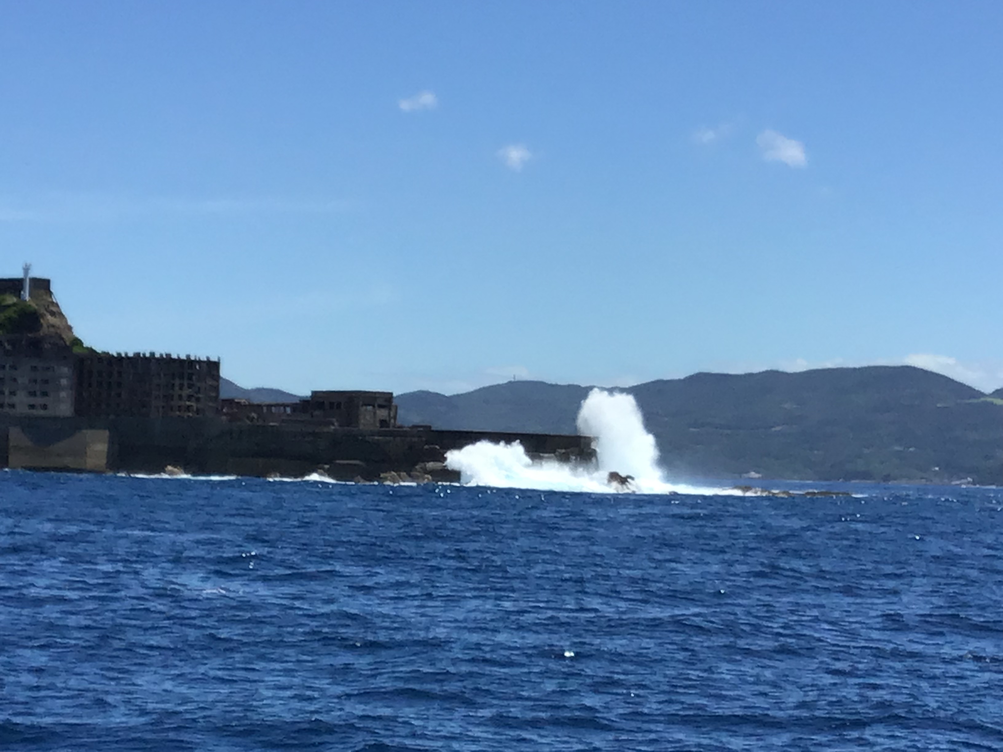 台風の影響がでており、本日もうねりが高く上陸ができませんでした。 大きなうねりが来ると10mもある護岸を簡単に超えてしまいます∑(゚Д゚) 自然の力は本当に凄いですね! 皆様には、迫力ある軍艦島を見ていただけたかと思います!